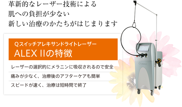 アレキサンドライトレーザー「ALEX2」は、過剰なメラニン色素のみに効果が作用し、50ナノ秒という非常に短い照射時間でレーザー光を当てているため、患部周辺の正常な皮膚組織にほとんどダメージを与えることなく治療を行うことができます。